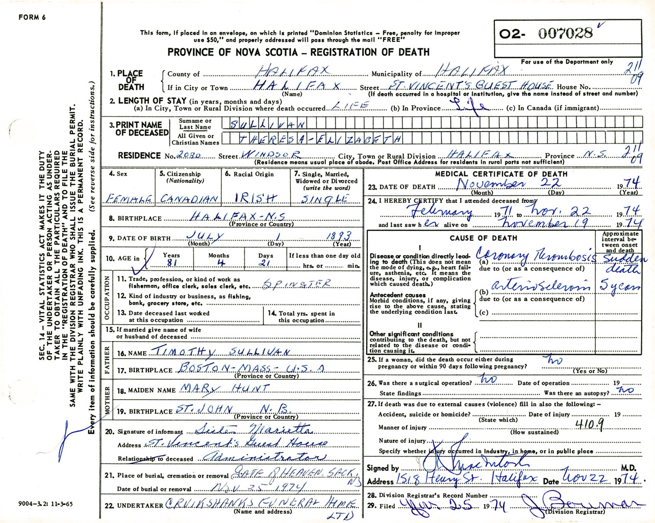 Female Death Registration: Year: 1974 number: 7028