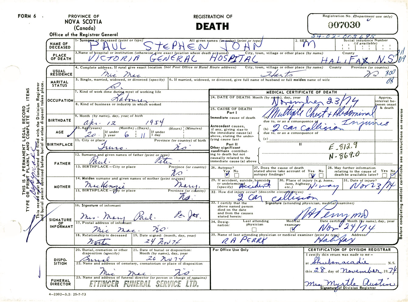 Male Death Registration: Year: 1974 number: 7030