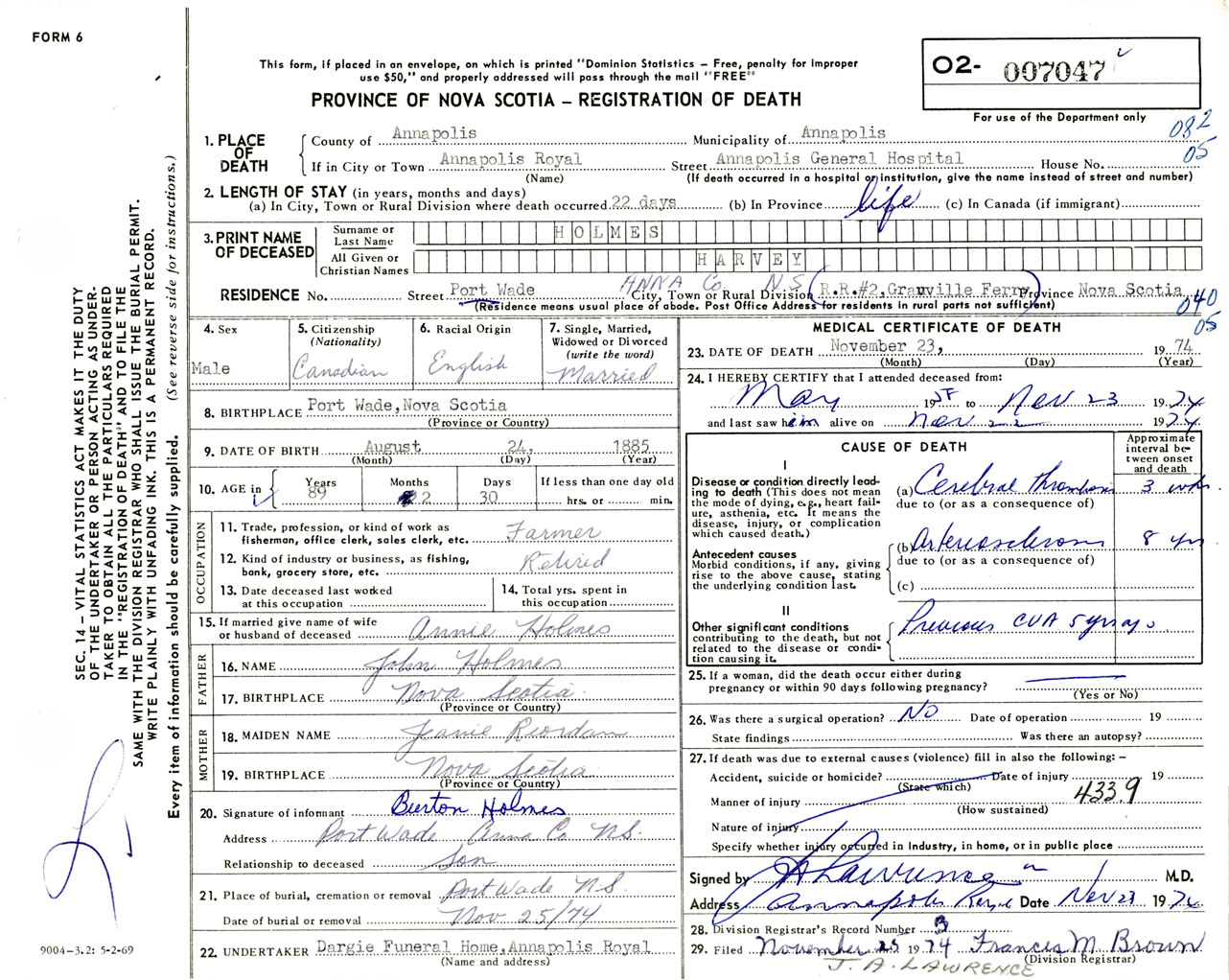 Male Death Registration: Year: 1974 number: 7047
