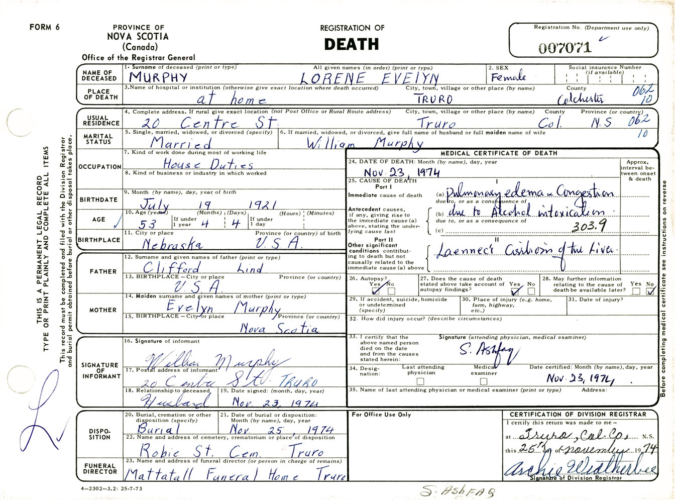 Female Death Registration: Year: 1974 number: 7071
