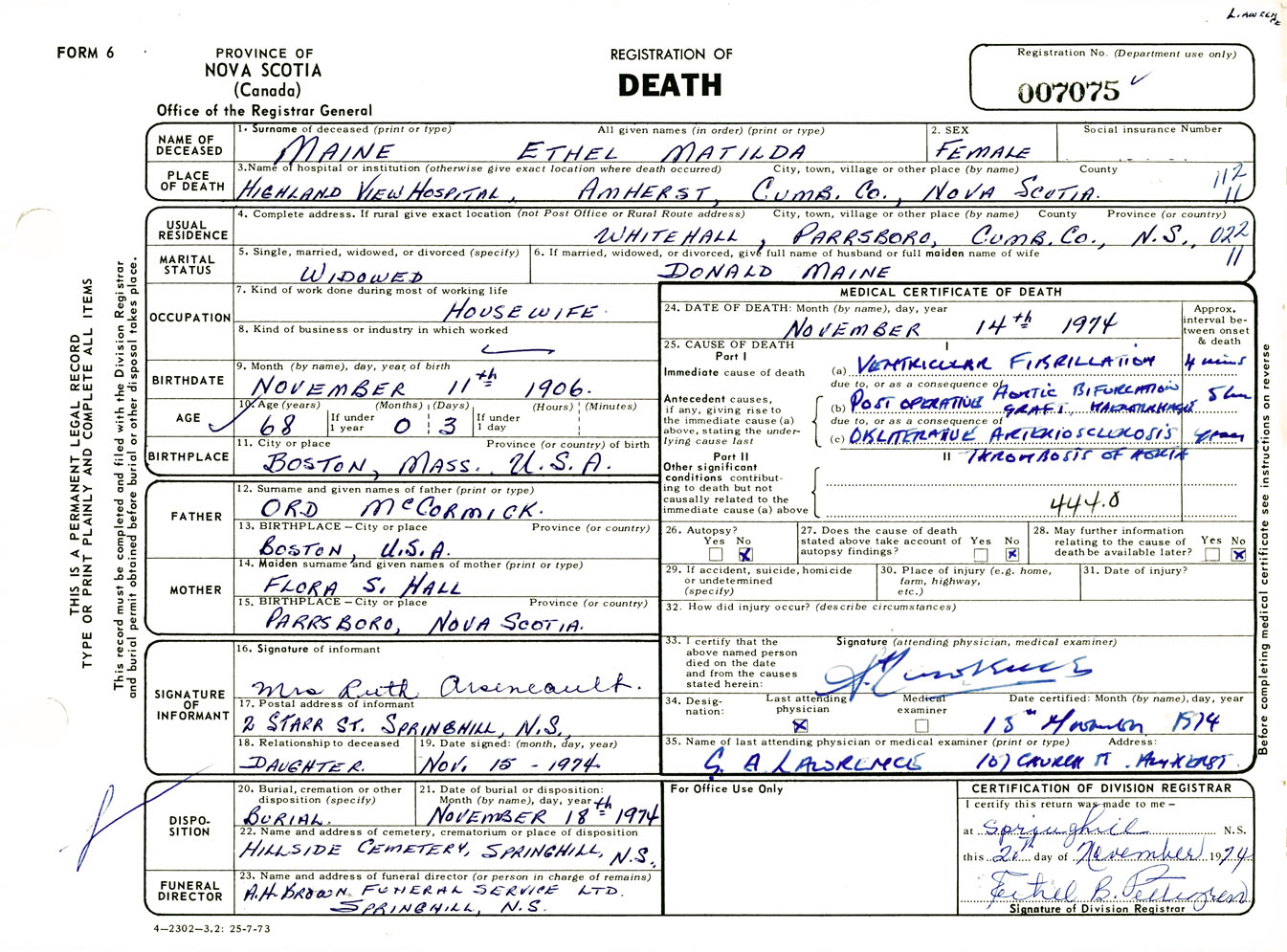 Female Death Registration: Year: 1974 number: 7075