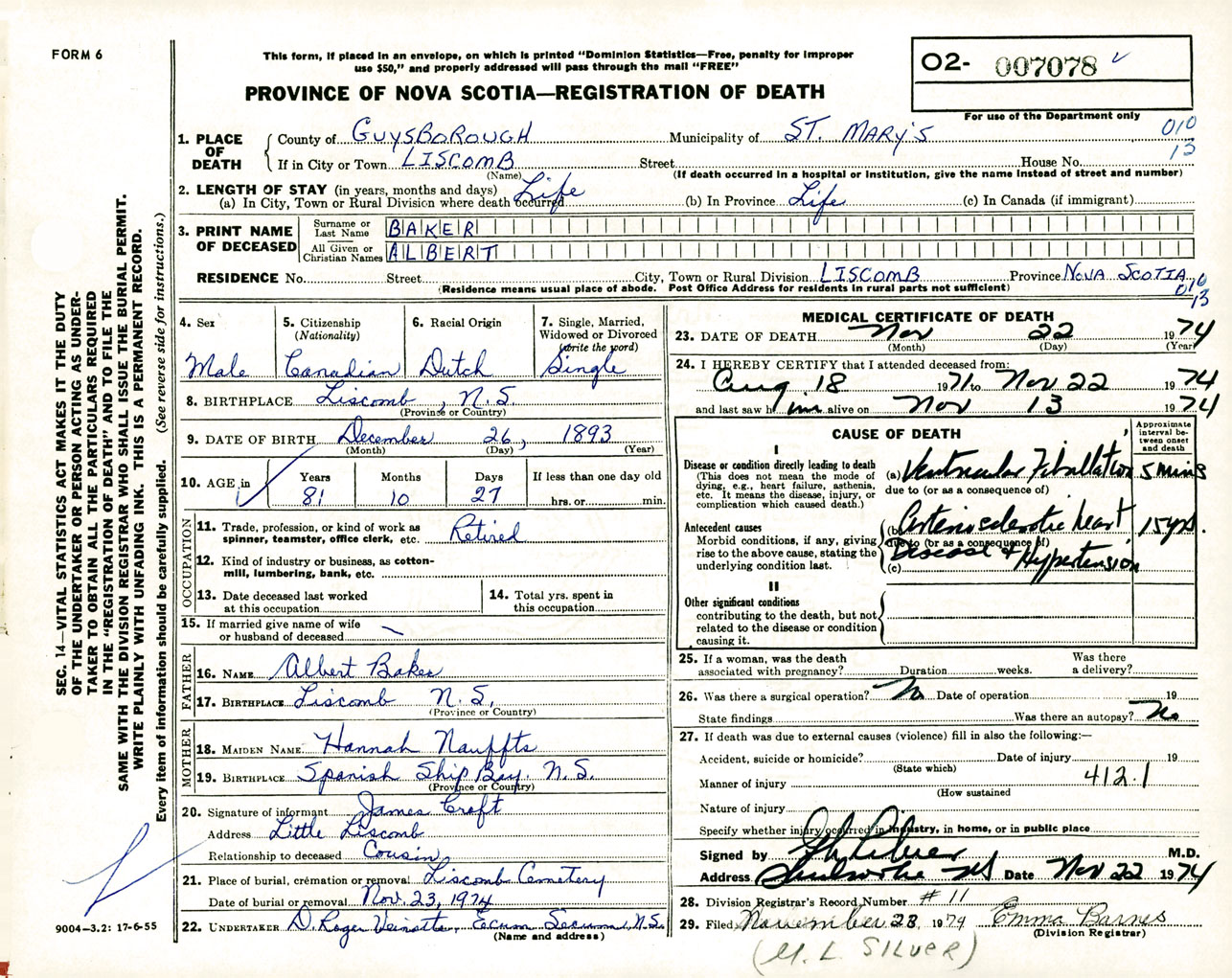 Male Death Registration: Year: 1974 number: 7078