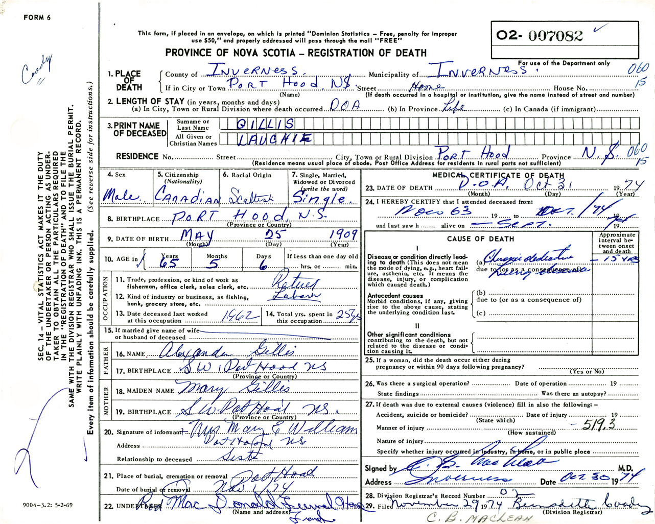 Male Death Registration: Year: 1974 number: 7082