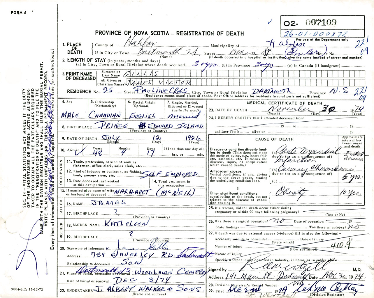 Male Death Registration: Year: 1974 number: 7109