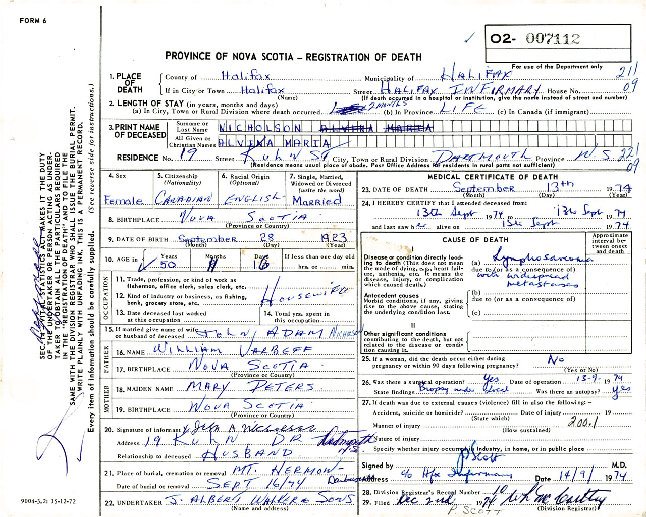 Female Death Registration: Year: 1974 number: 7112
