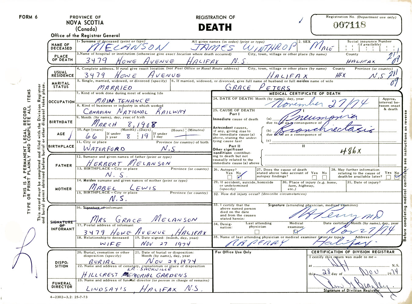 Male Death Registration: Year: 1974 number: 7118