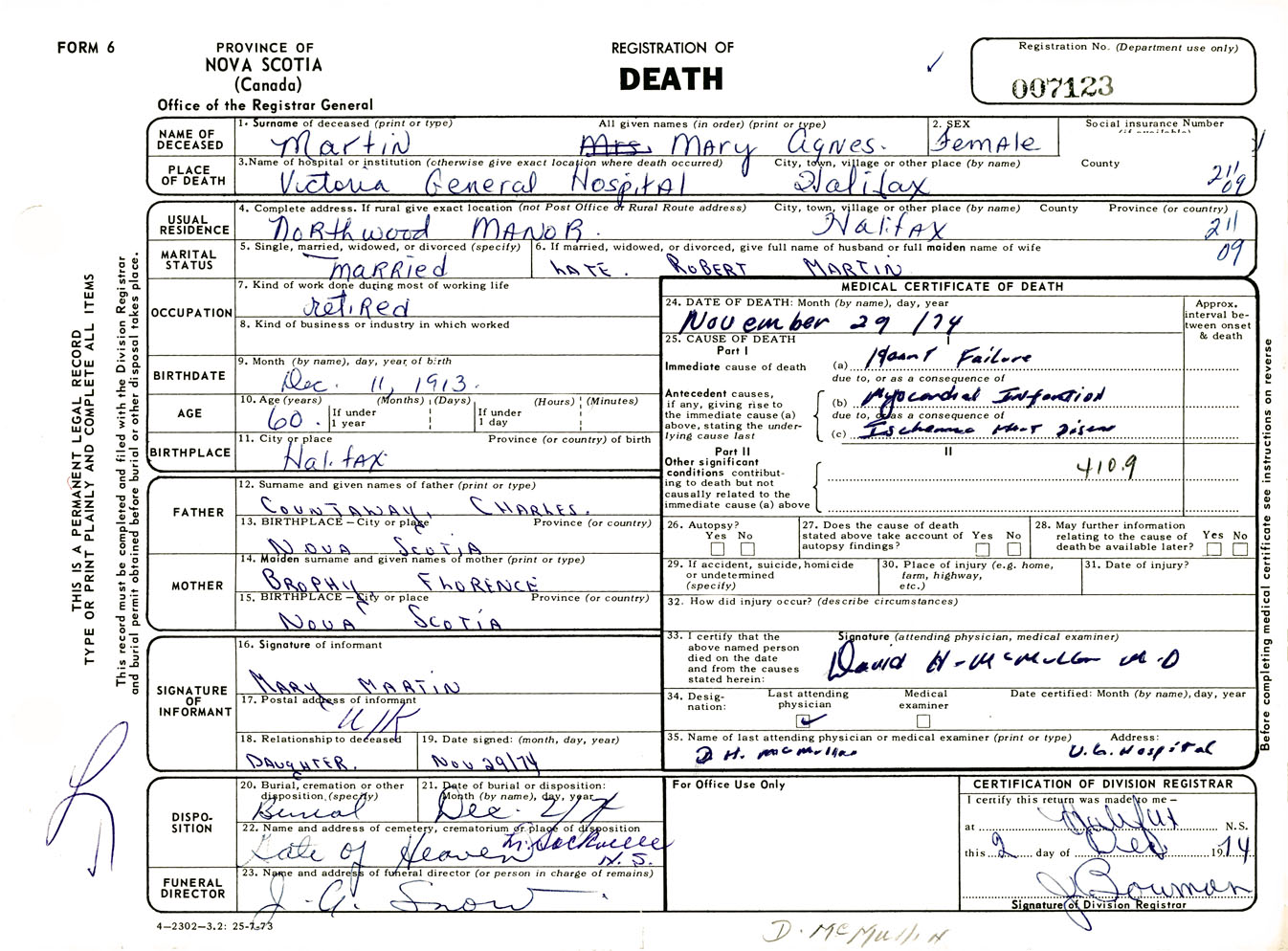 Female Death Registration: Year: 1974 number: 7123