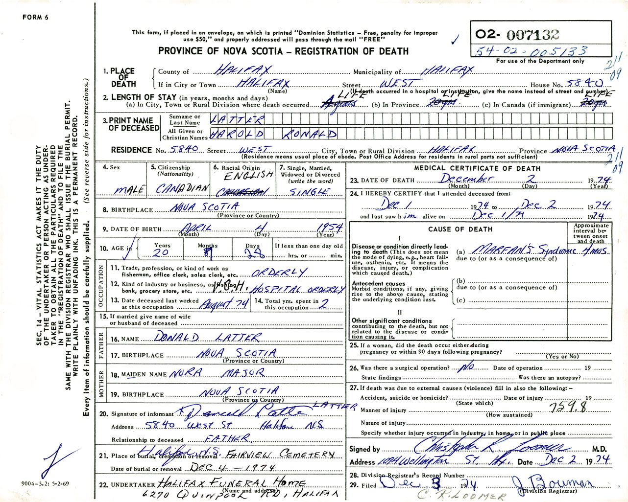 Male Death Registration: Year: 1974 number: 7132