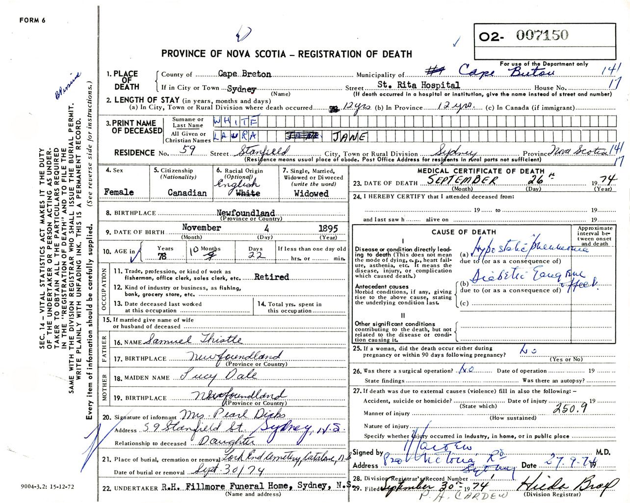 Female Death Registration: Year: 1974 number: 7150