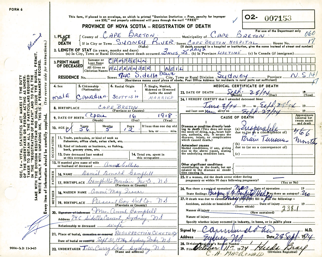 Male Death Registration: Year: 1974 number: 7153