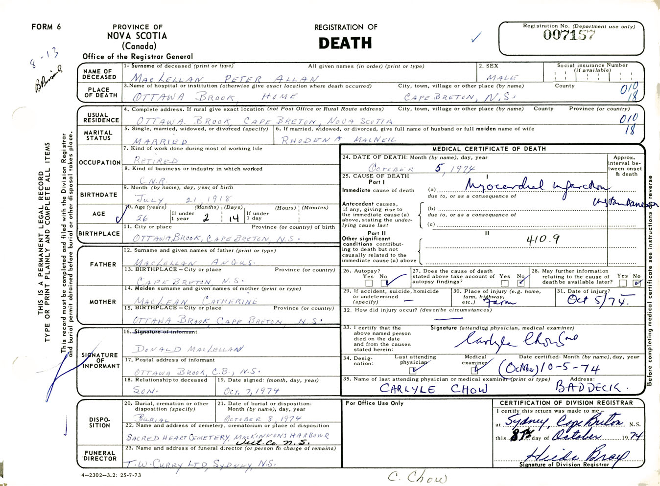 Male Death Registration: Year: 1974 number: 7157