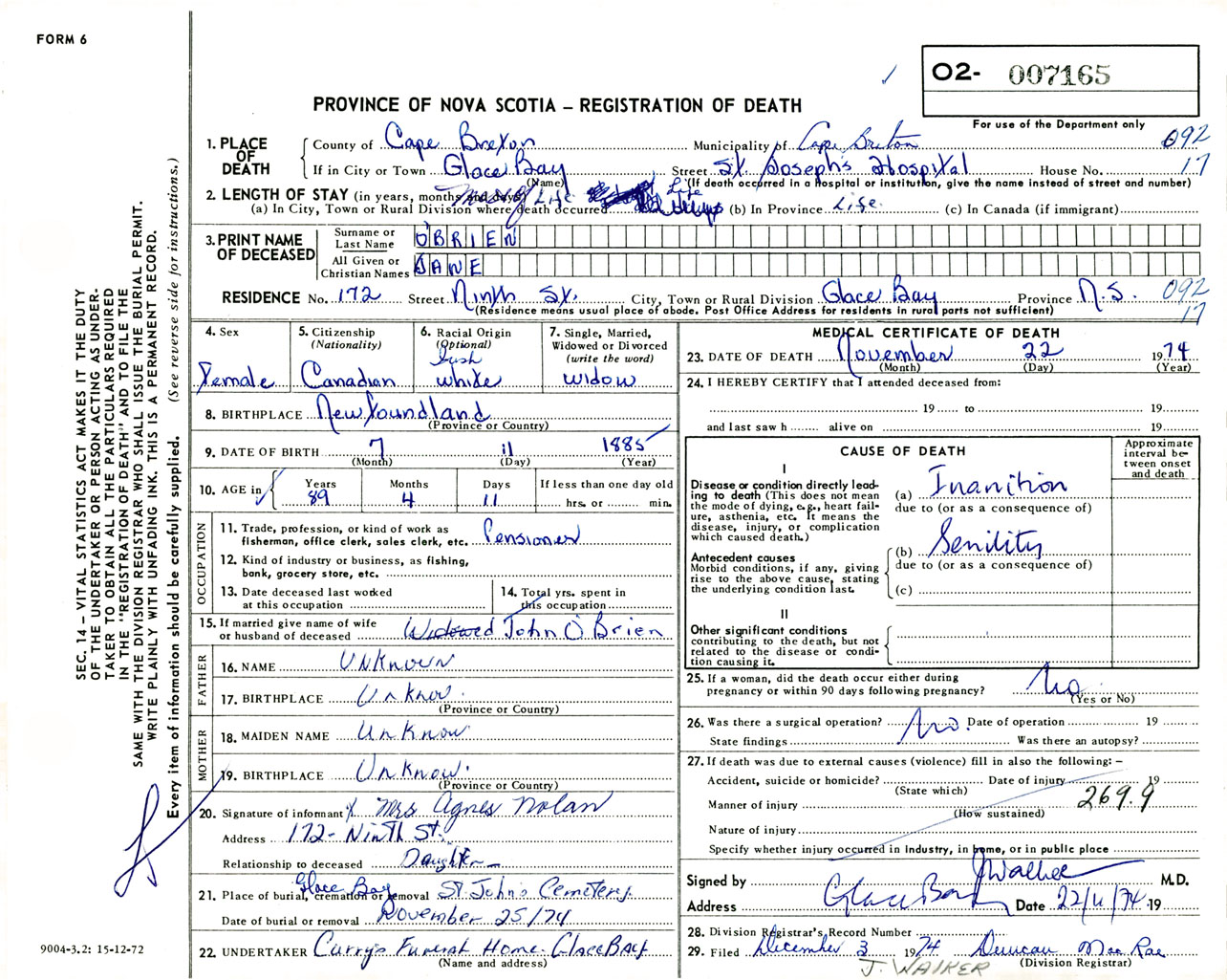 Female Death Registration: Year: 1974 number: 7165