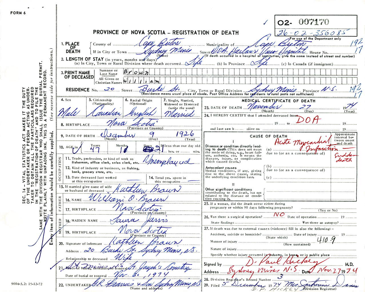 Male Death Registration: Year: 1974 number: 7170