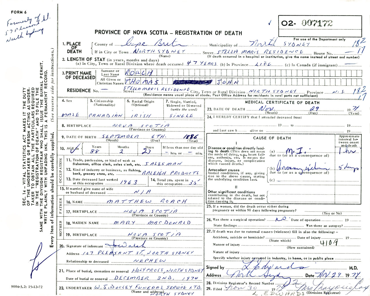 Male Death Registration: Year: 1974 number: 7172