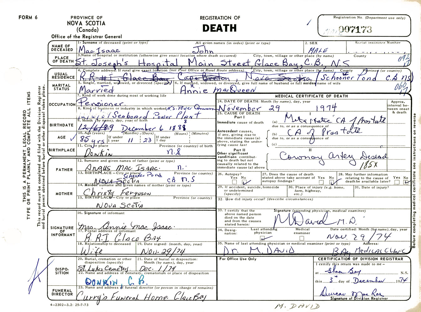 Male Death Registration: Year: 1974 number: 7173