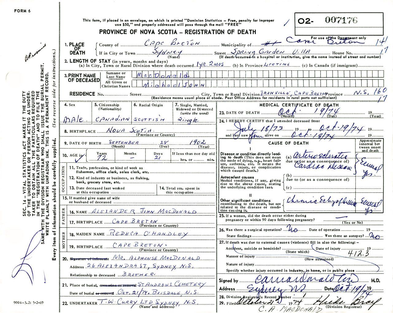 Male Death Registration: Year: 1974 number: 7176