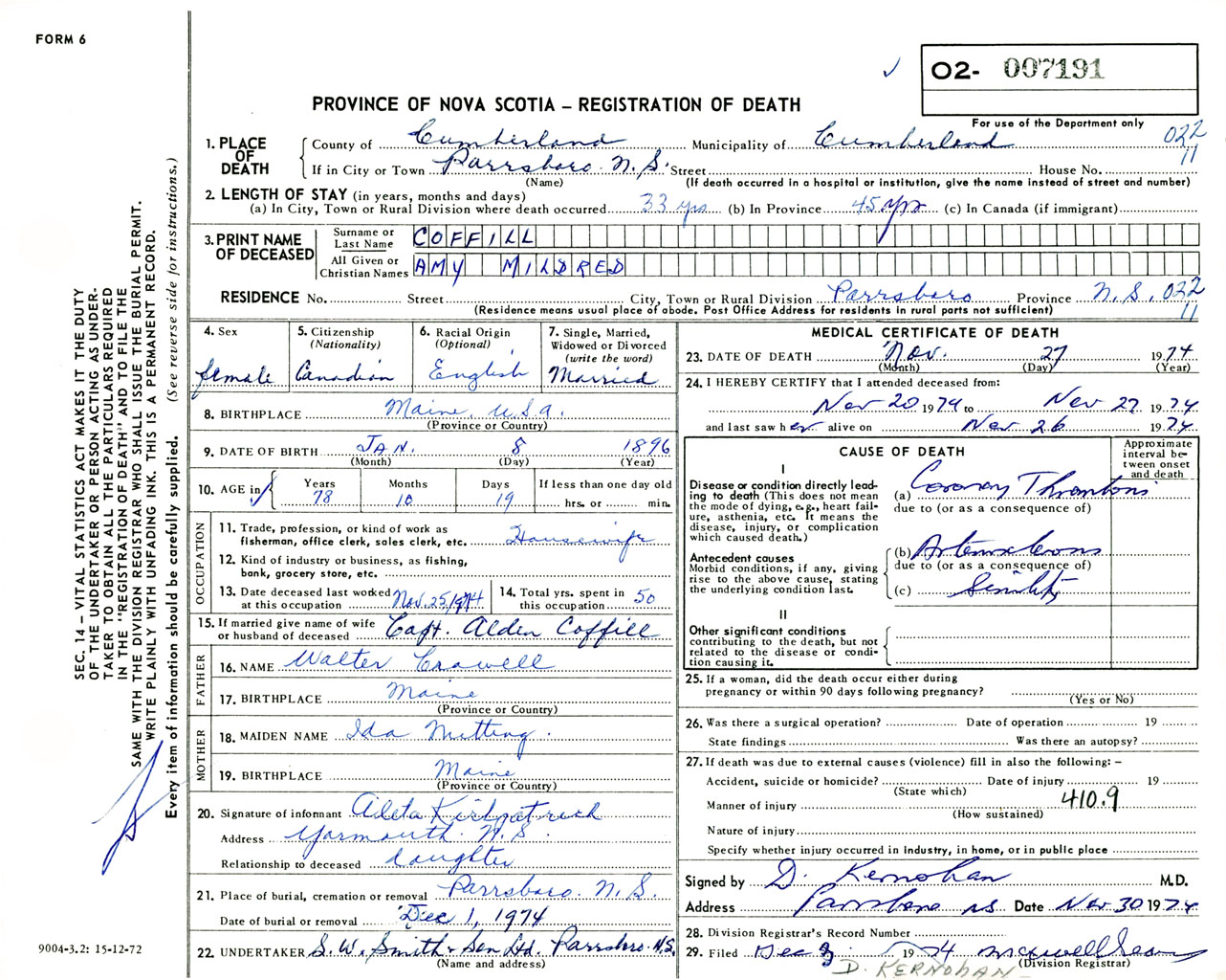 Female Death Registration: Year: 1974 number: 7191