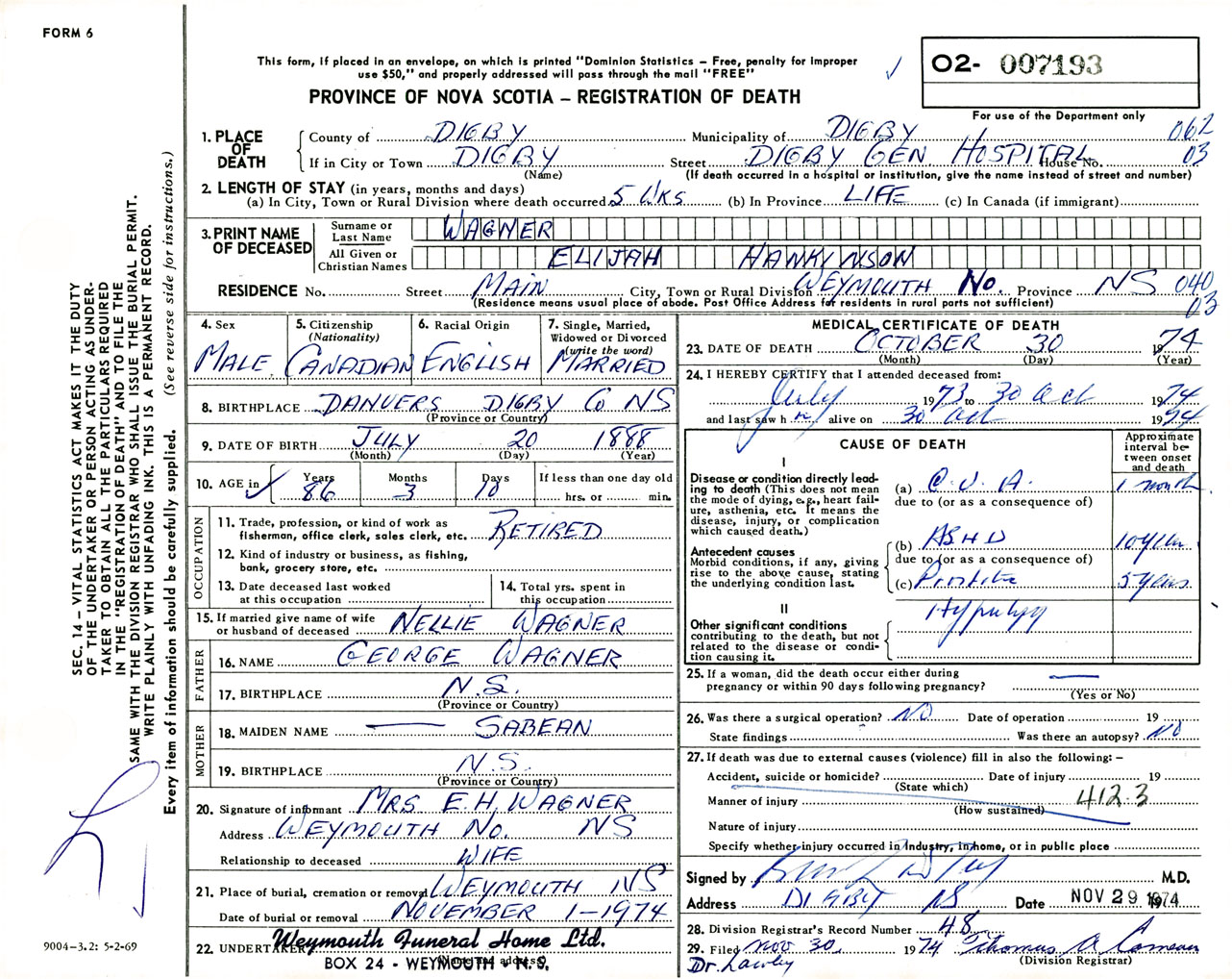 Male Death Registration: Year: 1974 number: 7193