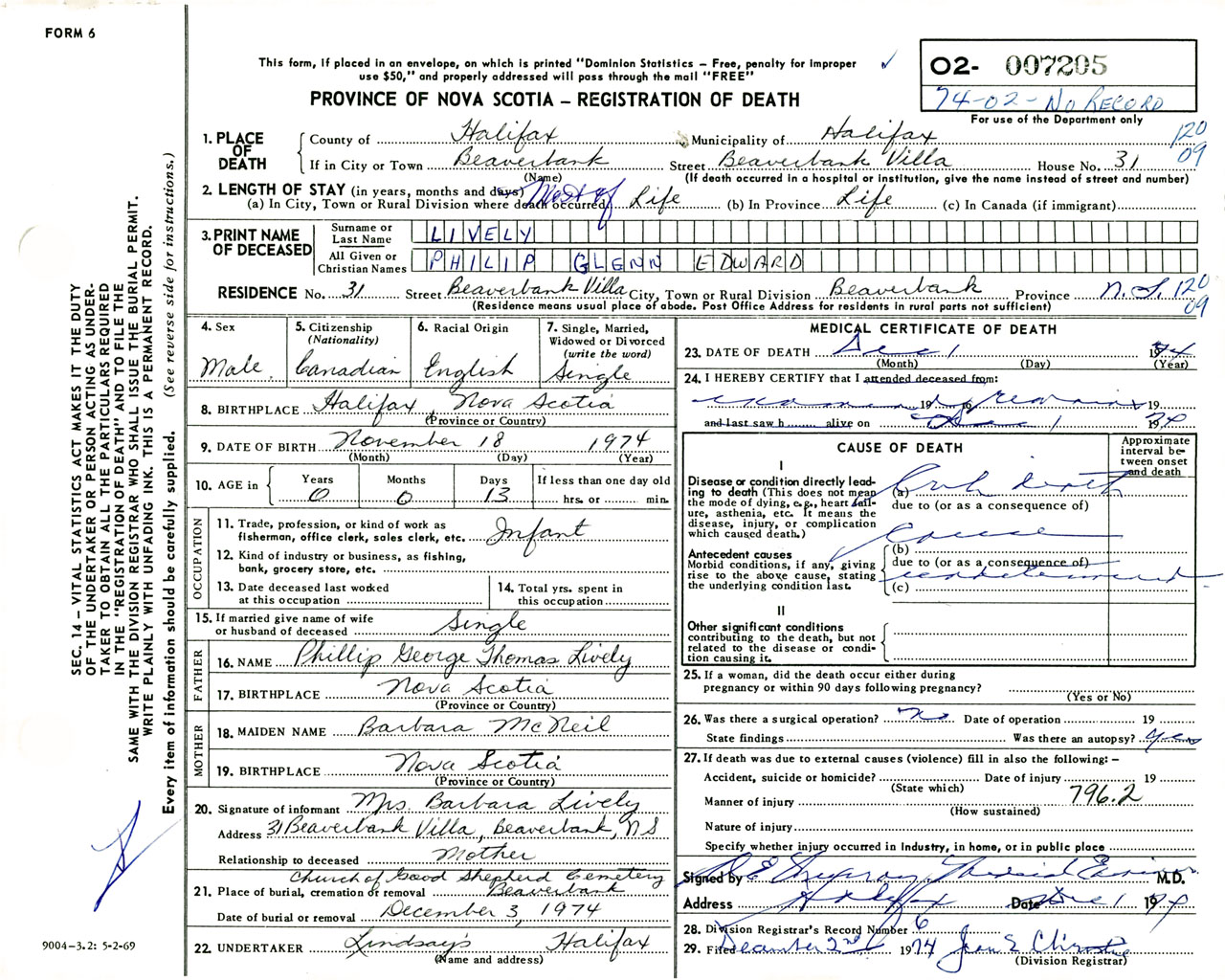 Male Death Registration: Year: 1974 number: 7205