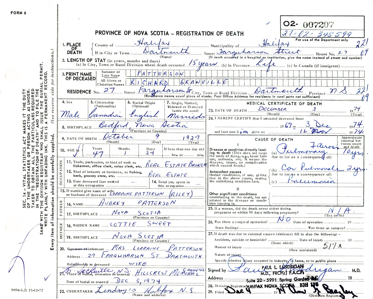 Male Death Registration: Year: 1974 number: 7207