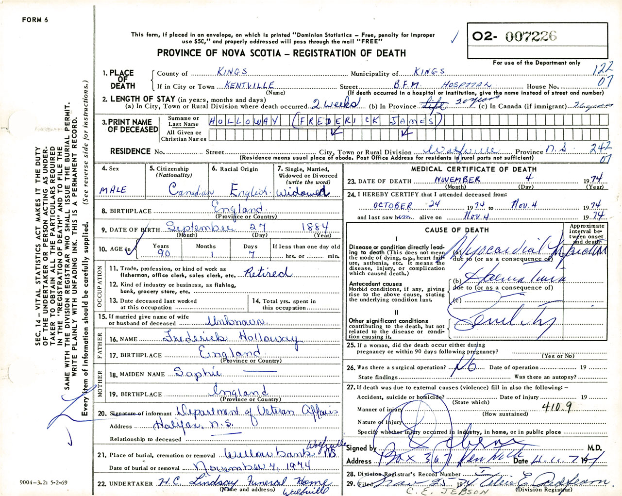 Male Death Registration: Year: 1974 number: 7226