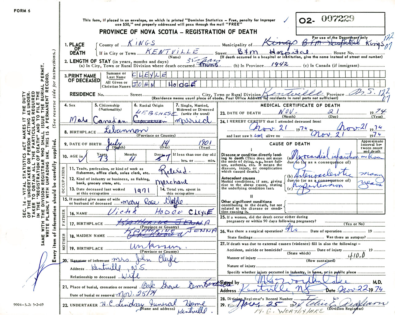 Male Death Registration: Year: 1974 number: 7229