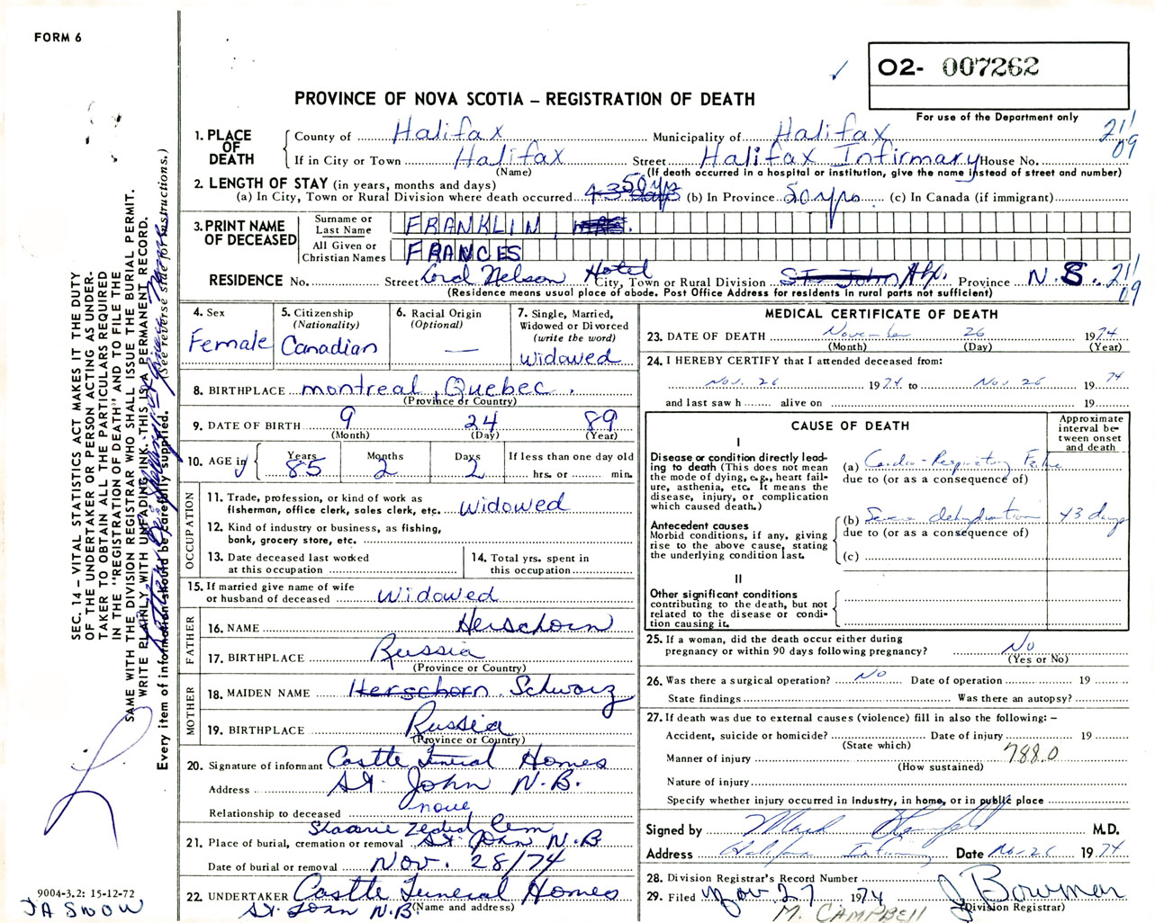 Female Death Registration: Year: 1974 number: 7262