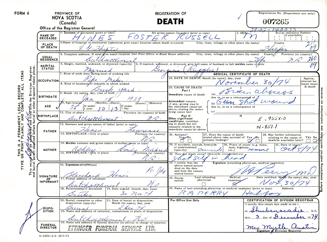 Male Death Registration: Year: 1974 number: 7265