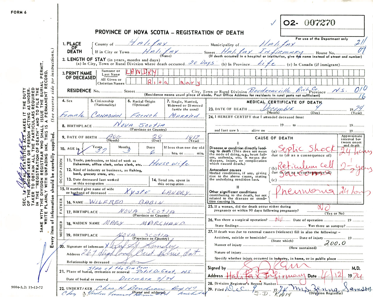 Female Death Registration: Year: 1974 number: 7270