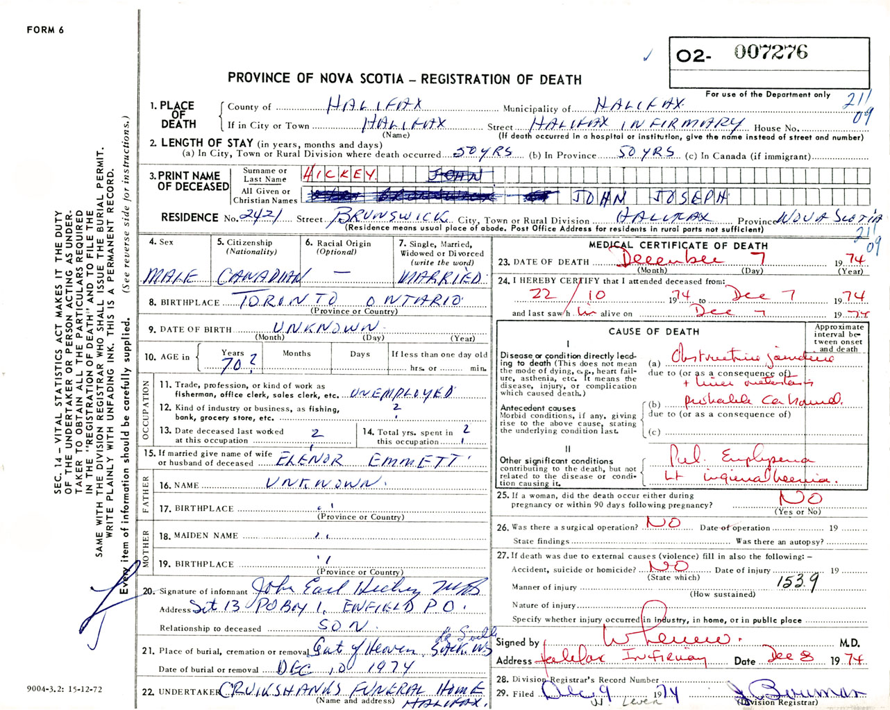 Male Death Registration: Year: 1974 number: 7276