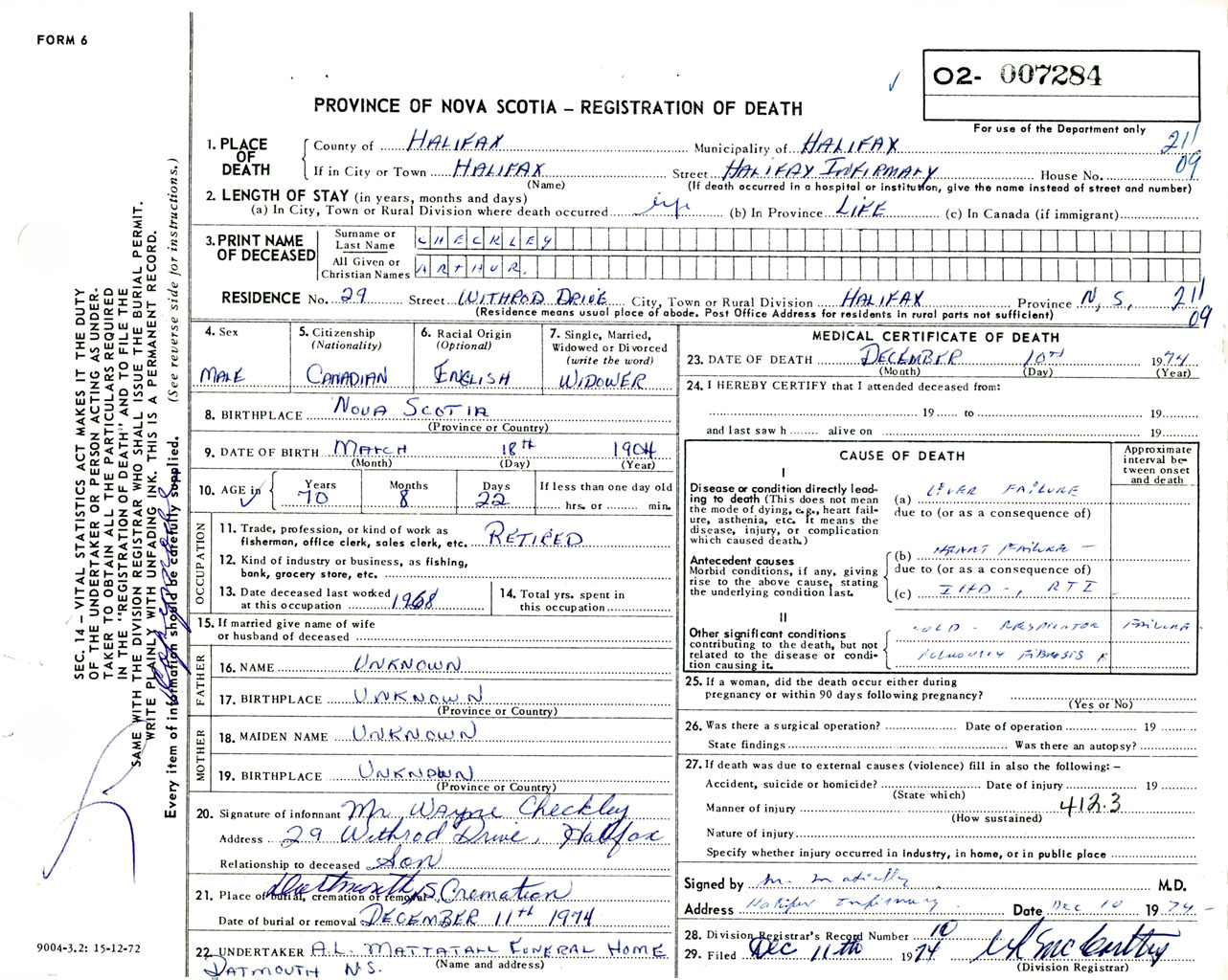 Male Death Registration: Year: 1974 number: 7284