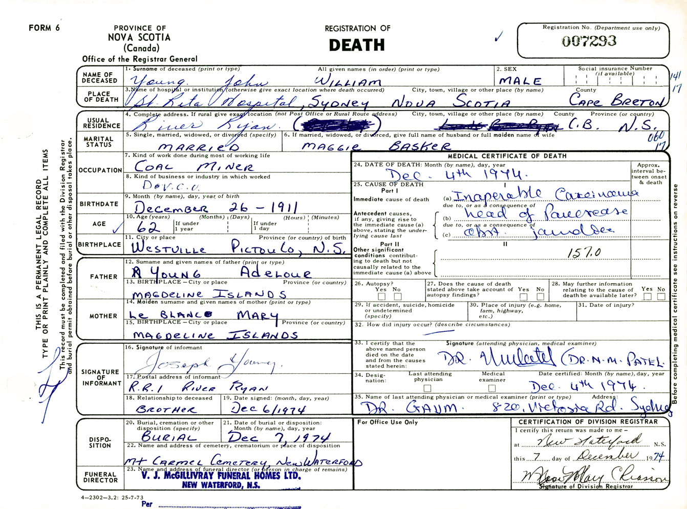 Male Death Registration: Year: 1974 number: 7293