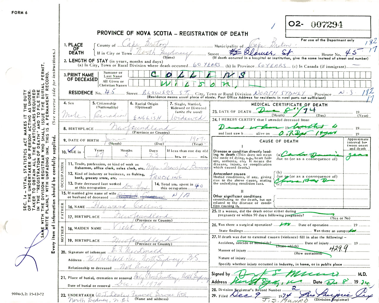 Male Death Registration: Year: 1974 number: 7294