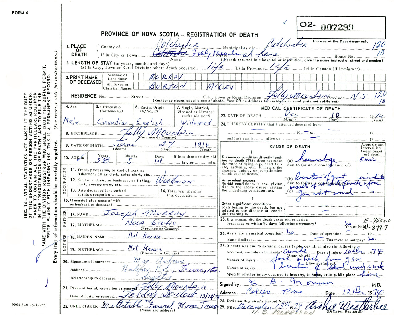 Male Death Registration: Year: 1974 number: 7299