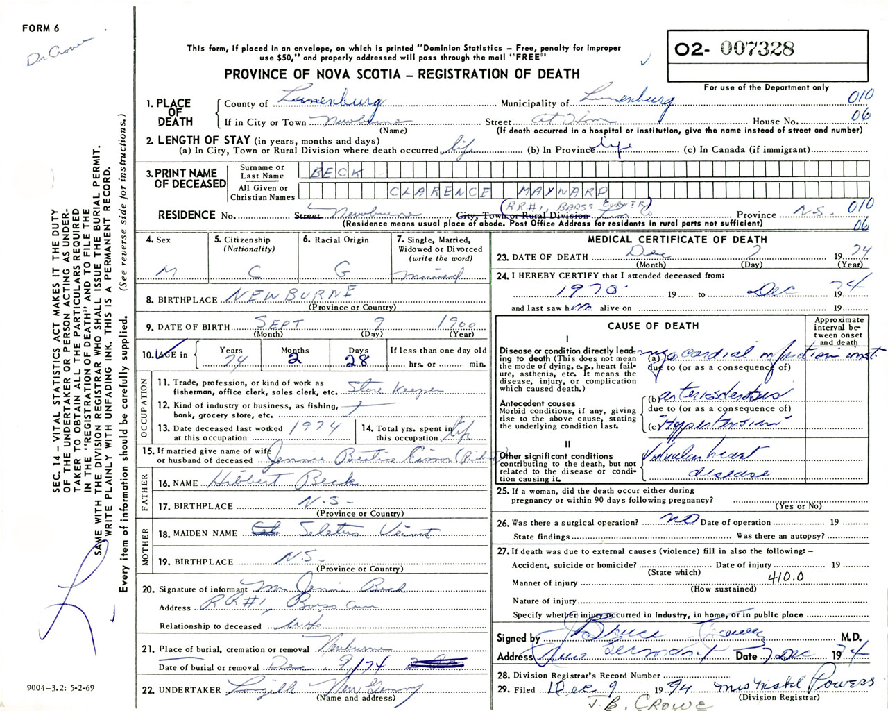 Male Death Registration: Year: 1974 number: 7328