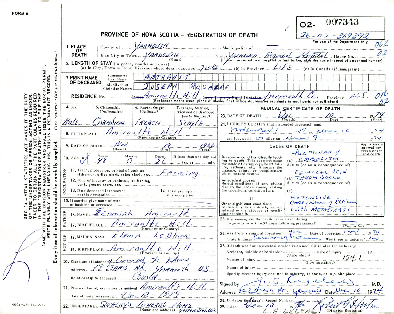 Male Death Registration: Year: 1974 number: 7343