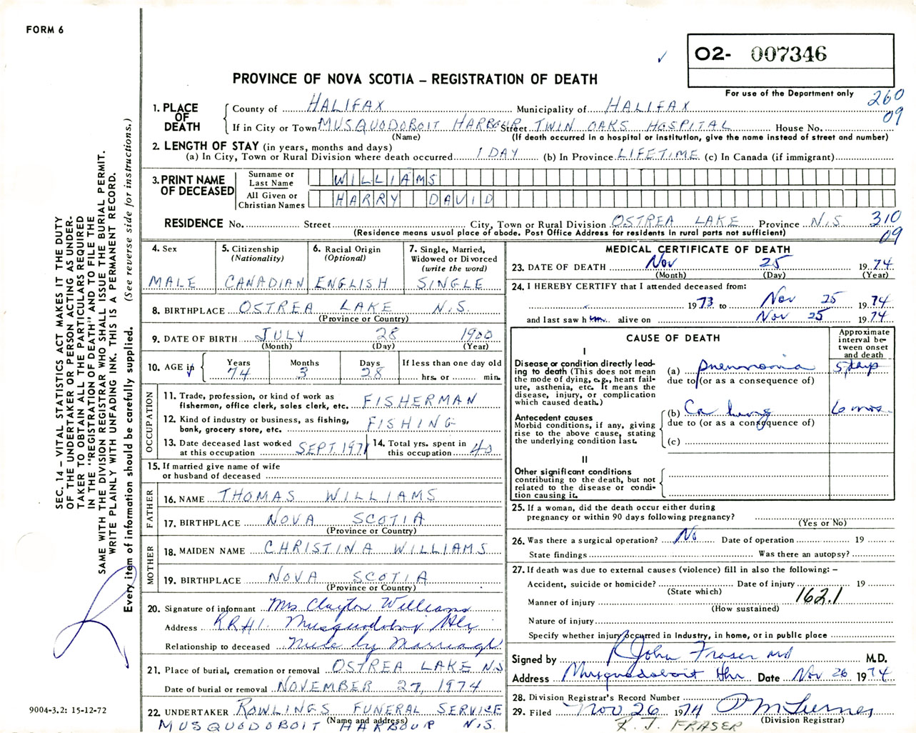 Male Death Registration: Year: 1974 number: 7346