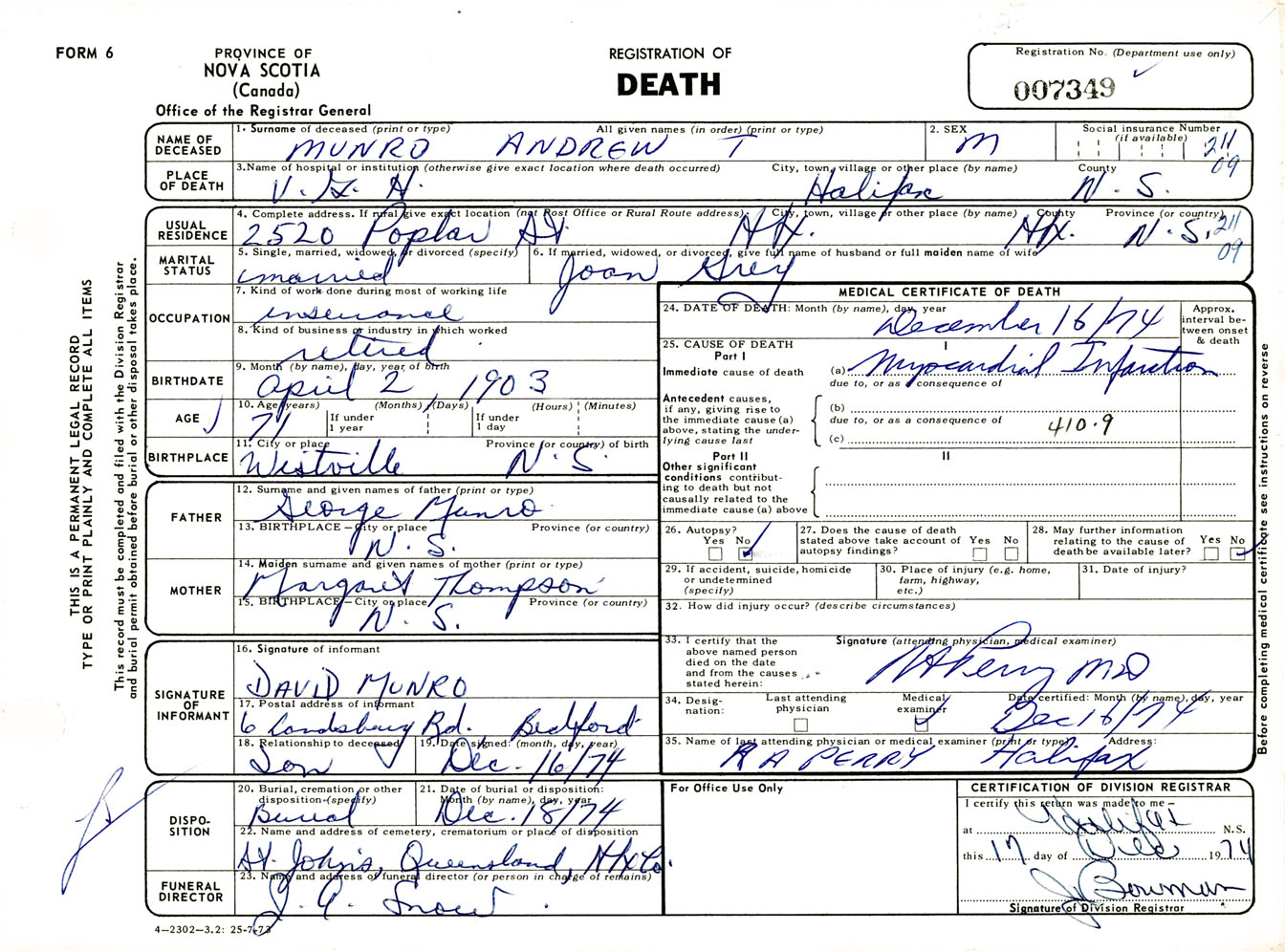 Male Death Registration: Year: 1974 number: 7349