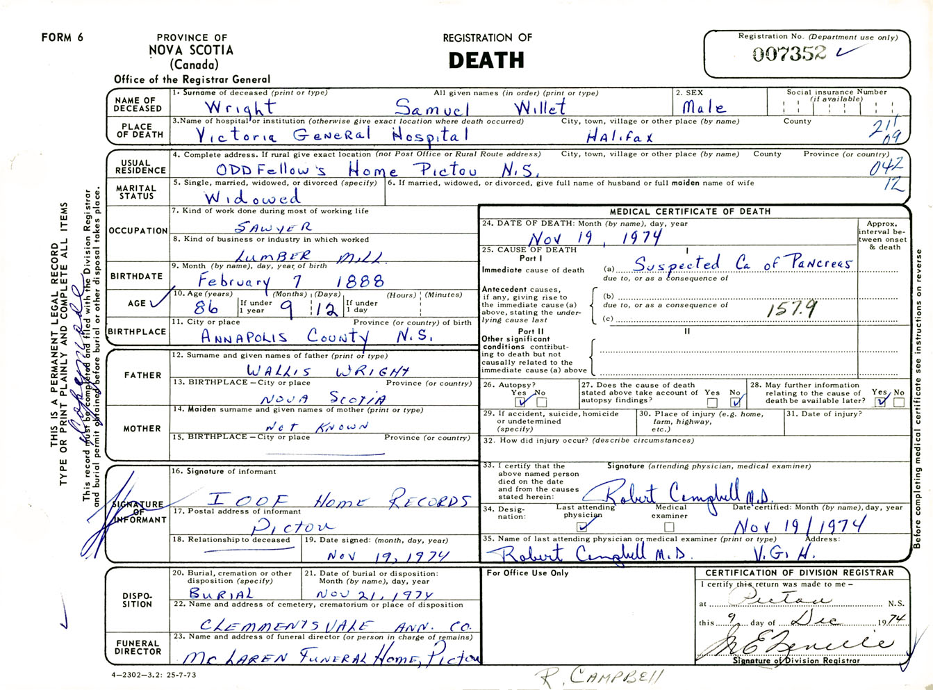 Male Death Registration: Year: 1974 number: 7352