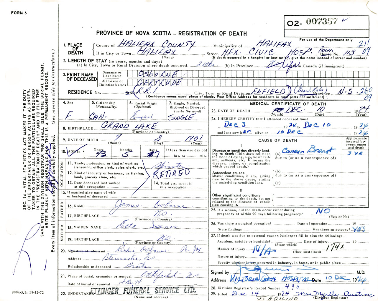 Female Death Registration: Year: 1974 number: 7357