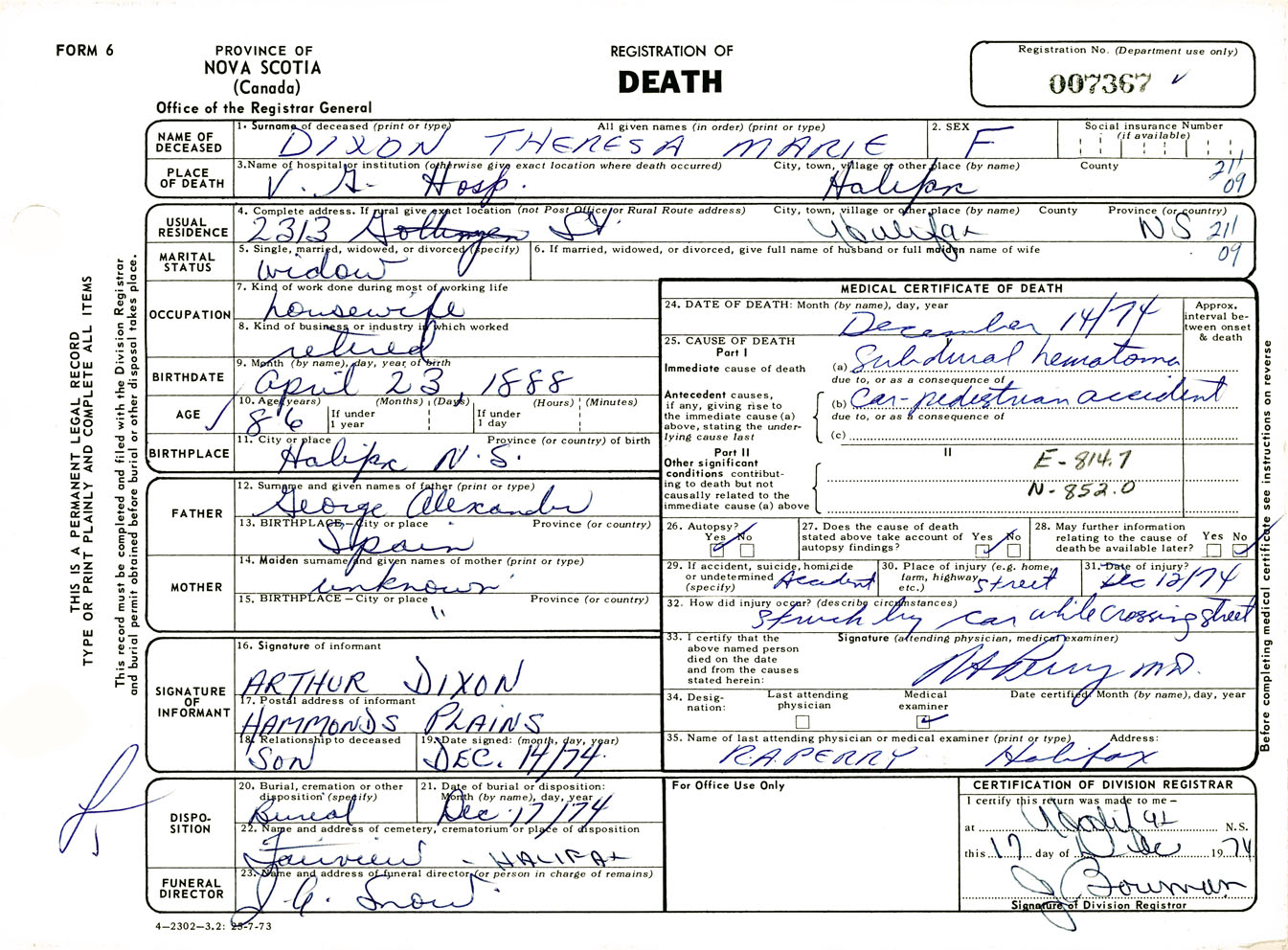 Female Death Registration: Year: 1974 number: 7367