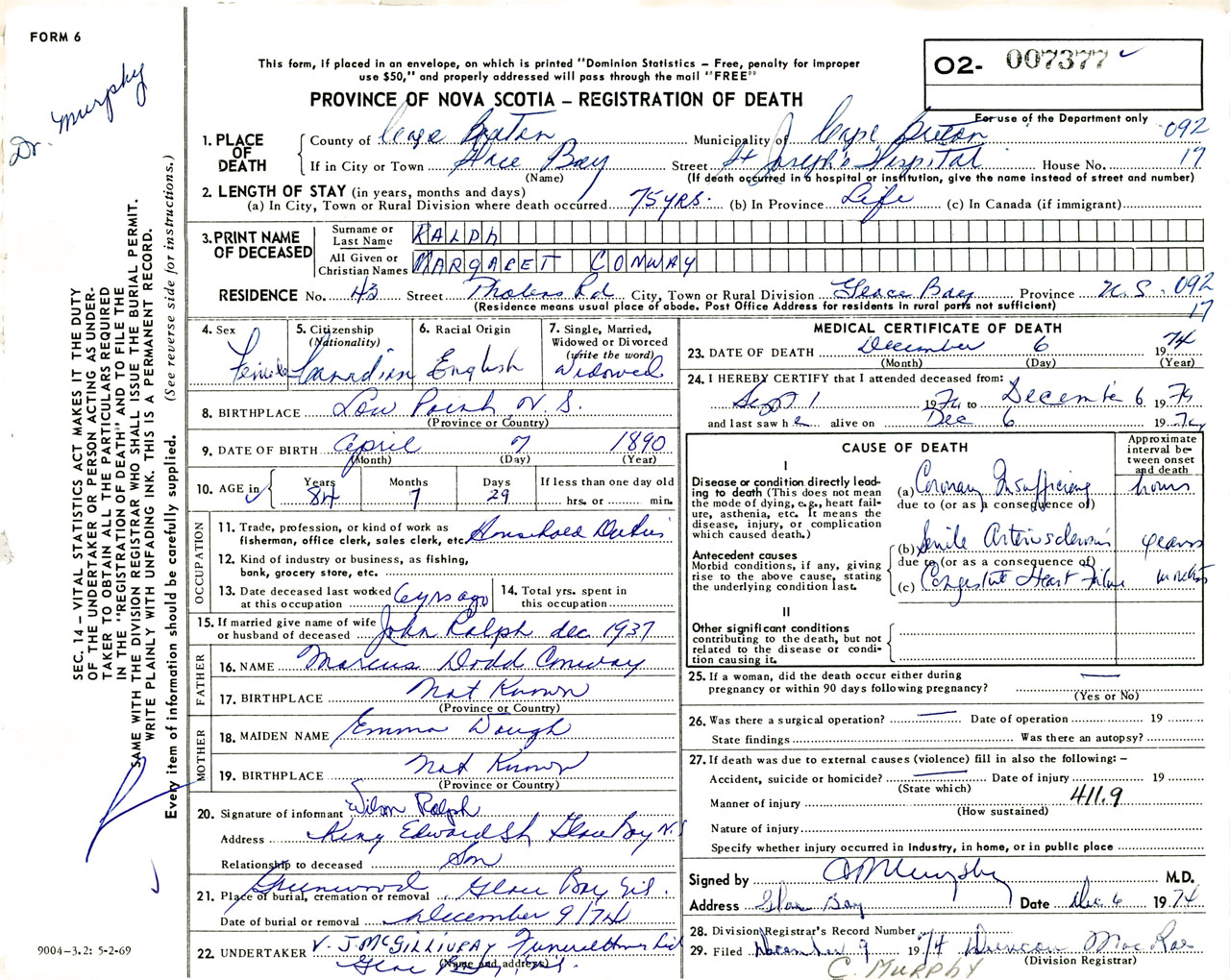 Female Death Registration: Year: 1974 number: 7377