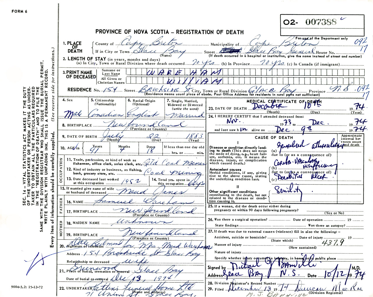 Male Death Registration: Year: 1974 number: 7388