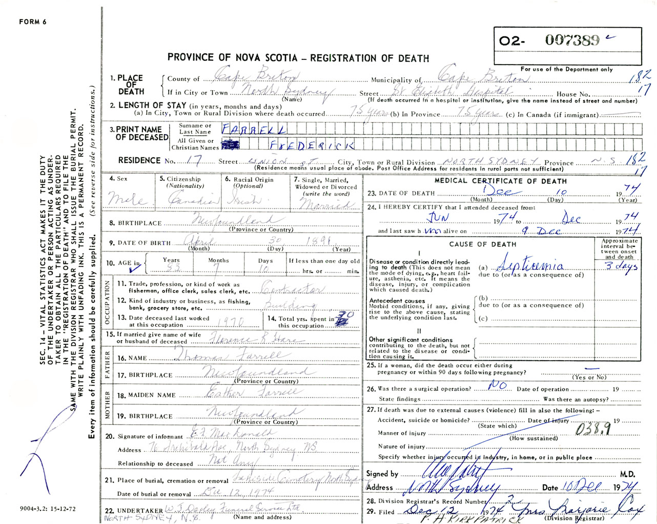 Male Death Registration: Year: 1974 number: 7389