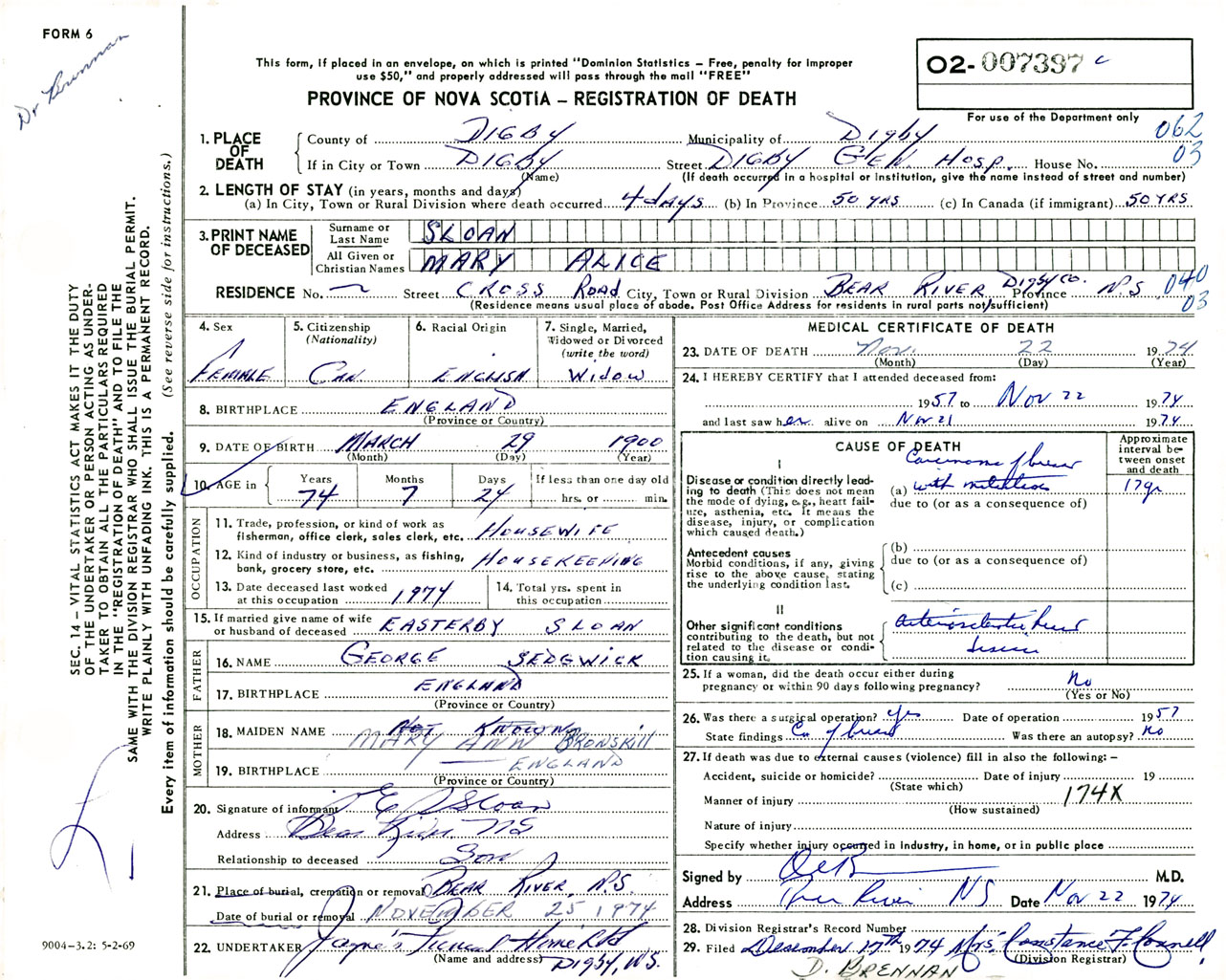Female Death Registration: Year: 1974 number: 7397