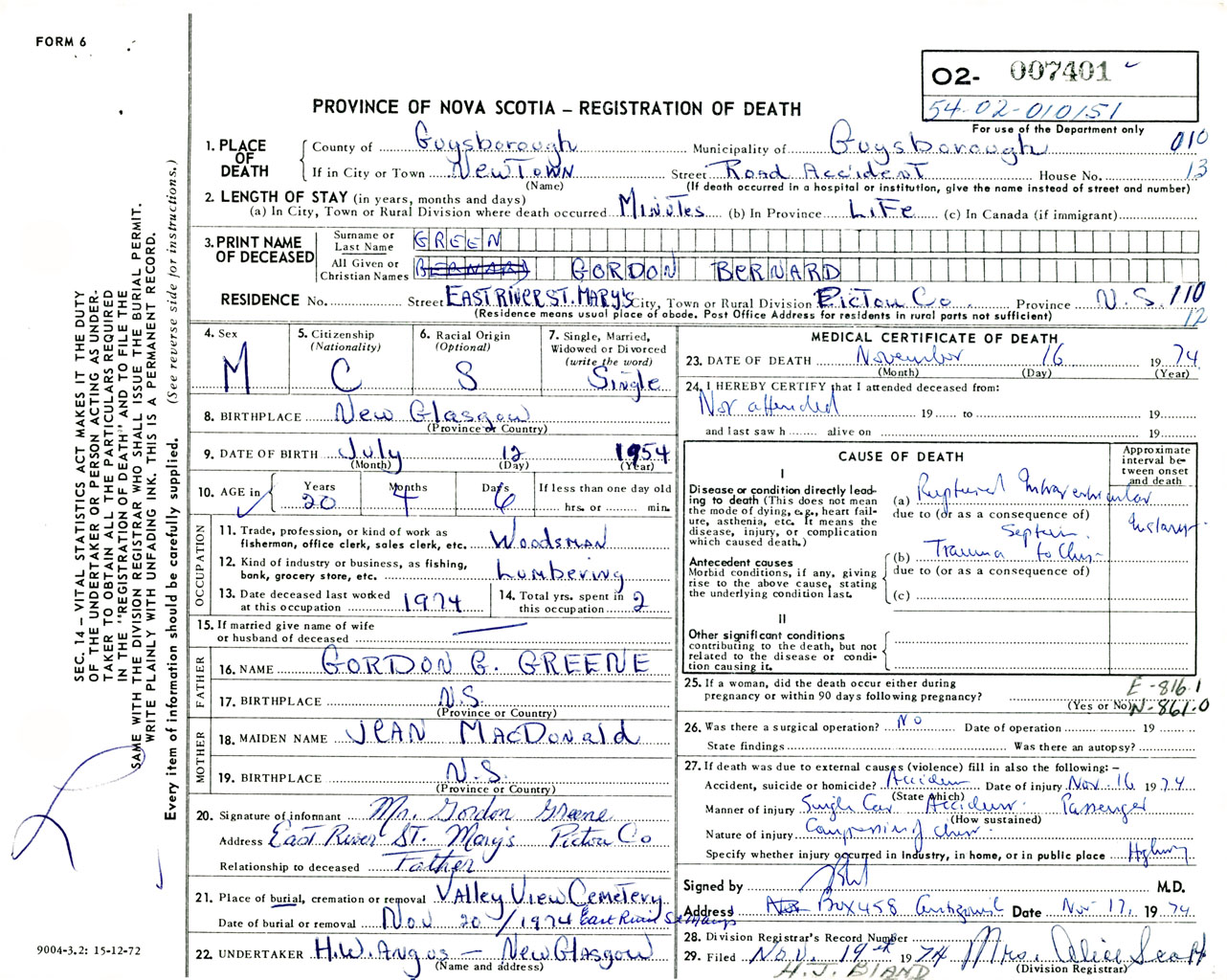 Male Death Registration: Year: 1974 number: 7401