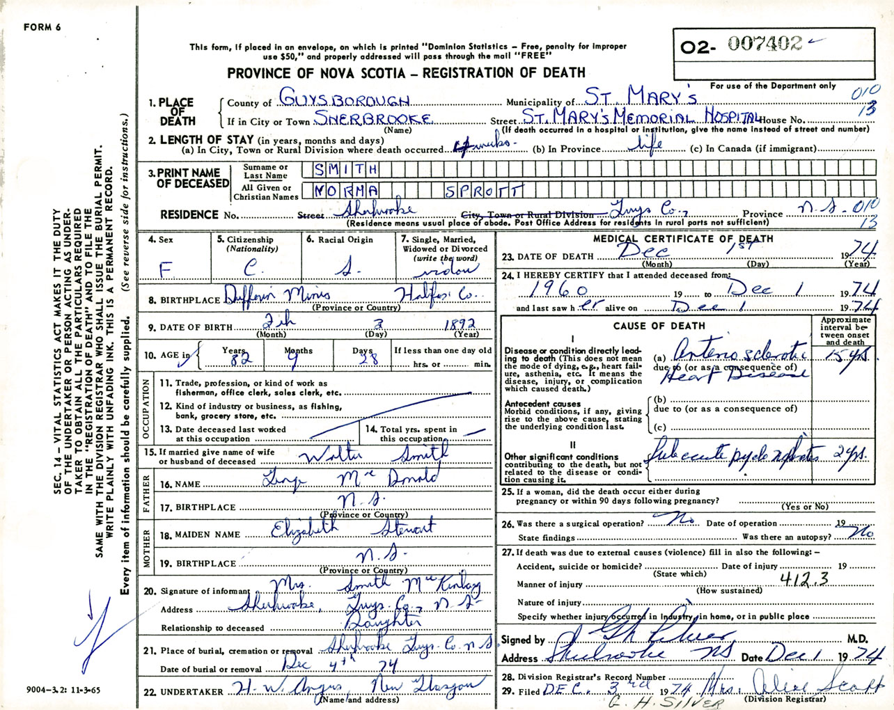 Female Death Registration: Year: 1974 number: 7402