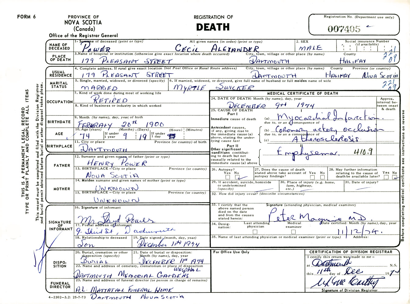Male Death Registration: Year: 1974 number: 7405
