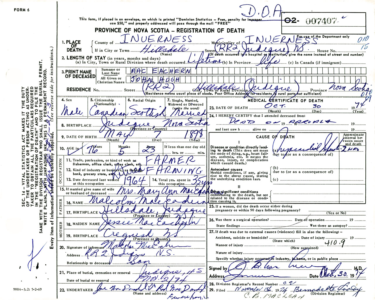 Male Death Registration: Year: 1974 number: 7407