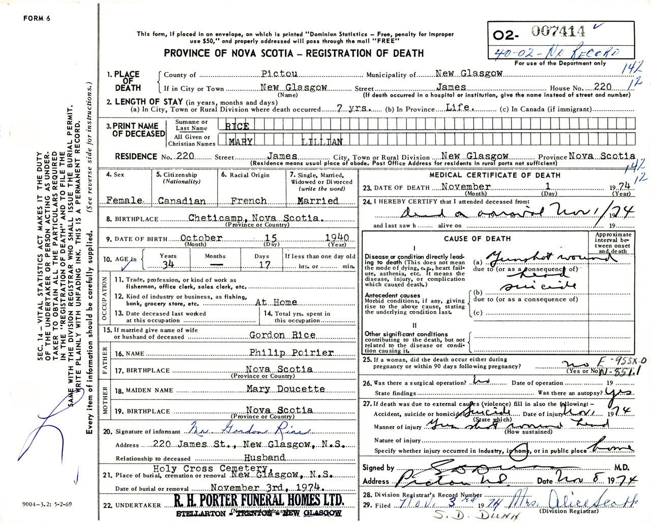 Female Death Registration: Year: 1974 number: 7414
